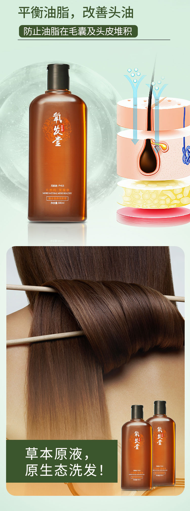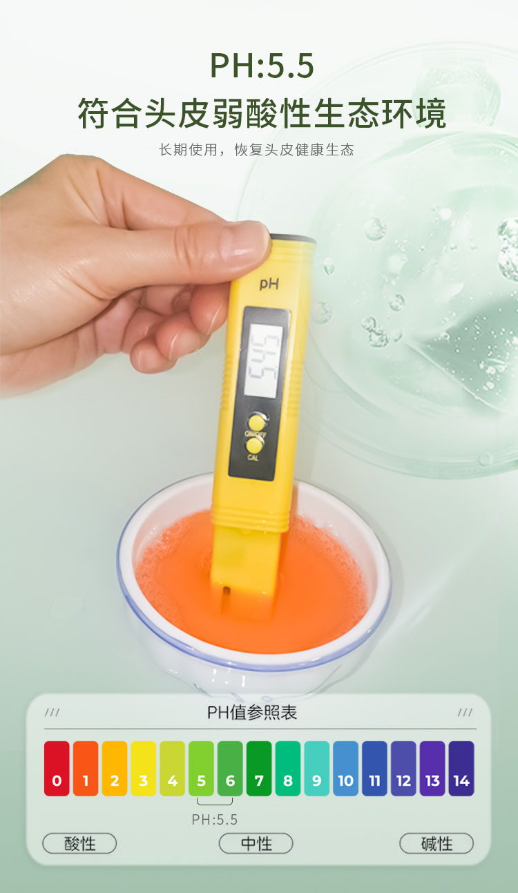 3、符合头皮弱酸性(PH:5.5)生态环境,用天然成分清洁头发和头皮。