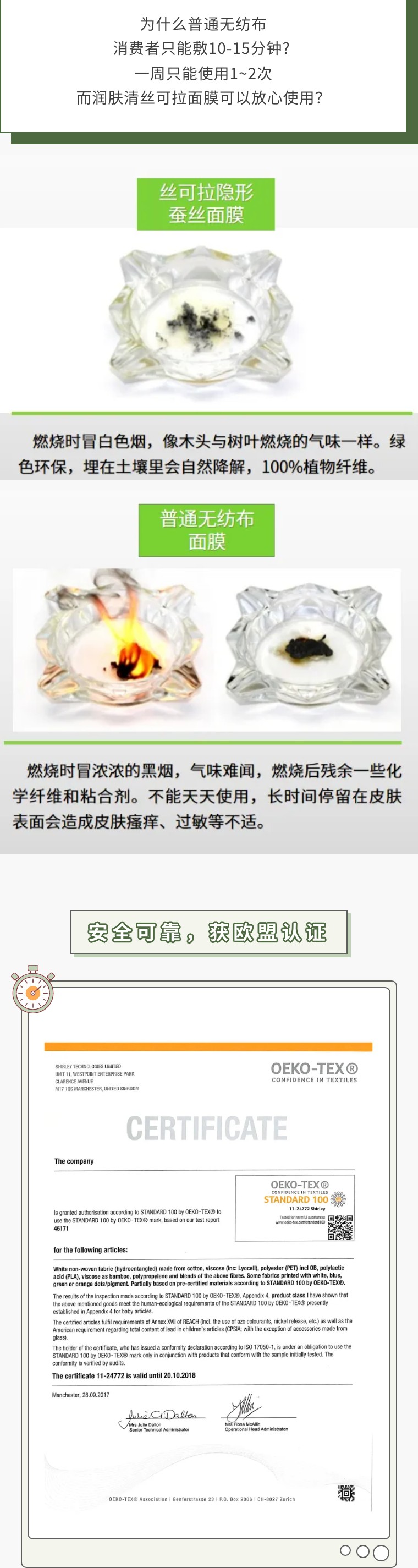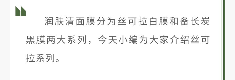 润肤清系列面膜就采用了以色列进口丝可拉膜布作为膜材,比传统的无纺布更加轻、薄、弹,敷在脸上很舒服,丝毫不会有闷的感觉,和脸部的贴合度也很高。既能够很好地贴合人脸轮廓,能吸收较多的精华,保湿锁水的效果显著。